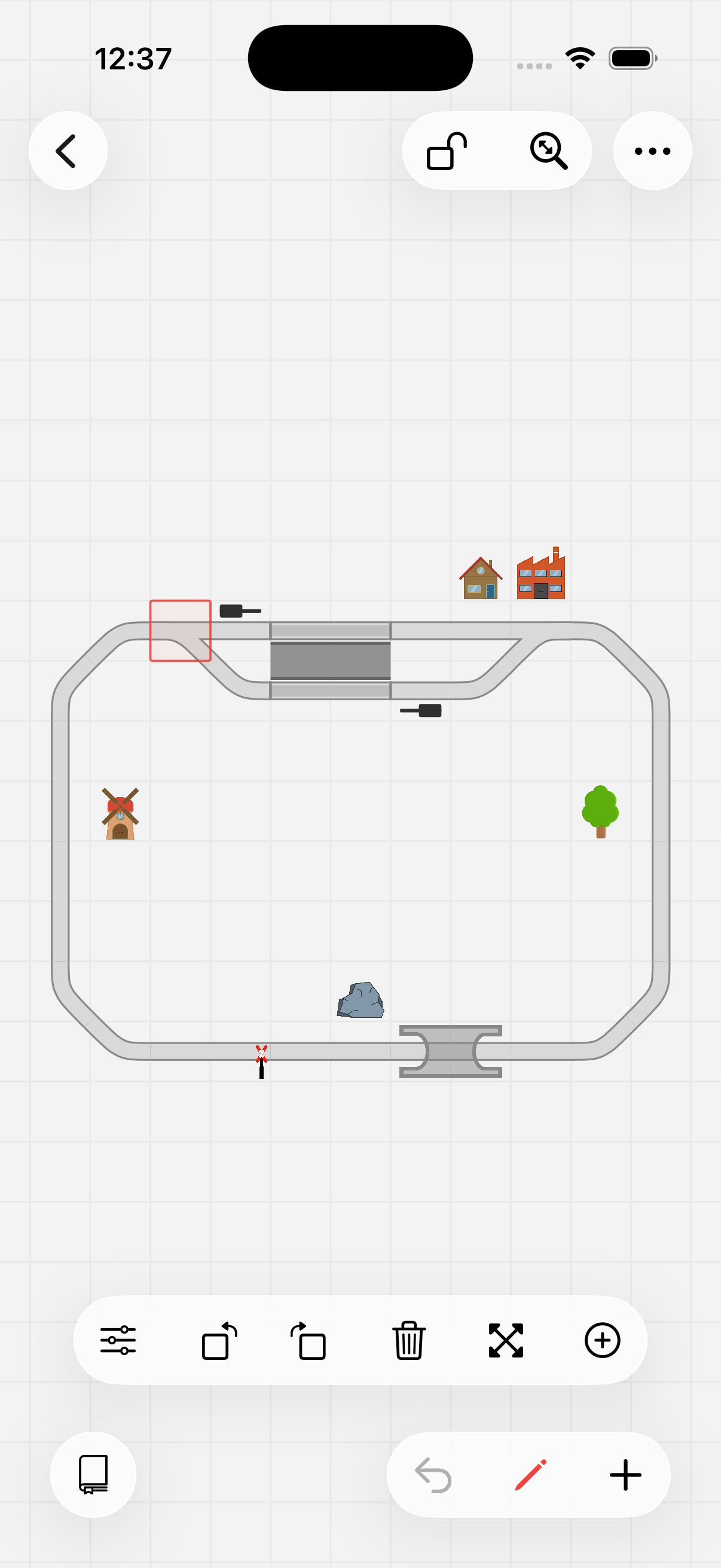 The layout editor lets you build a visual representation of your model train layout on a grid. This track plan is used in the throttle to show real-time accessory states and track occupancy, and in automation scripts to reference accessories and feedback sensors.